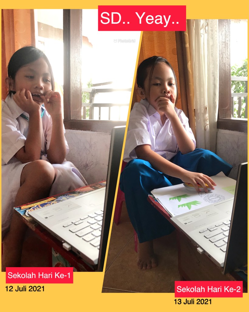 Namanya bocah, kadang ya mewek. “Aku nggak bisa mami. Susah sekali,” tangisnya sambil meletakkan bukunya lalu membenamkan muka ke bantal. Nangis tersedu-sedu. Aku dan suami terus ngeyem-yemi kalau dia down. Sampai hari ini dia masih ngrasa sulit bahasa Indonesia, khususnya mengarang cerita panjang, membuat puisi, dan buat pantun. Bahasa Inggris yang dulu kutakutkan justru dia merasa senang belajarnya. ❤️