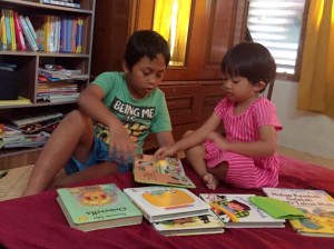 Membaca buku juga sangat penting untuk meningkatkan daya serap pada kosakata. Untuk anak-anak, pilih buku yang bergambar dan menarik. Baca buku bisa dilakukan di pagi hari, siang saat belajar, dan malam hari menjelang tidur. Setidaknya baca buku 5 kali sehari. Kalaupun anak kadang bosen baca dari depan dan membuka buku langsung ke belakang ya tidak apa-apa. Kita bercerita pada fokus yang dilihat anak.