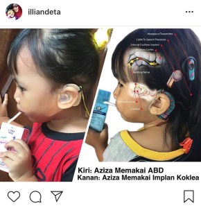Buat yang belum tau apa beda ABD dan Implan, ini foto saat Aziza memakai keduanya. Dari penampakan, ABD tidak perlu operasi dan speakernya dimasukkan ke dalam telinga. Implan harus dioperasi dan tak ada yang masuk telinga. Tapi ada coil nempel di kepala yang terhubung dengan magnet yang ditanam di kepala.